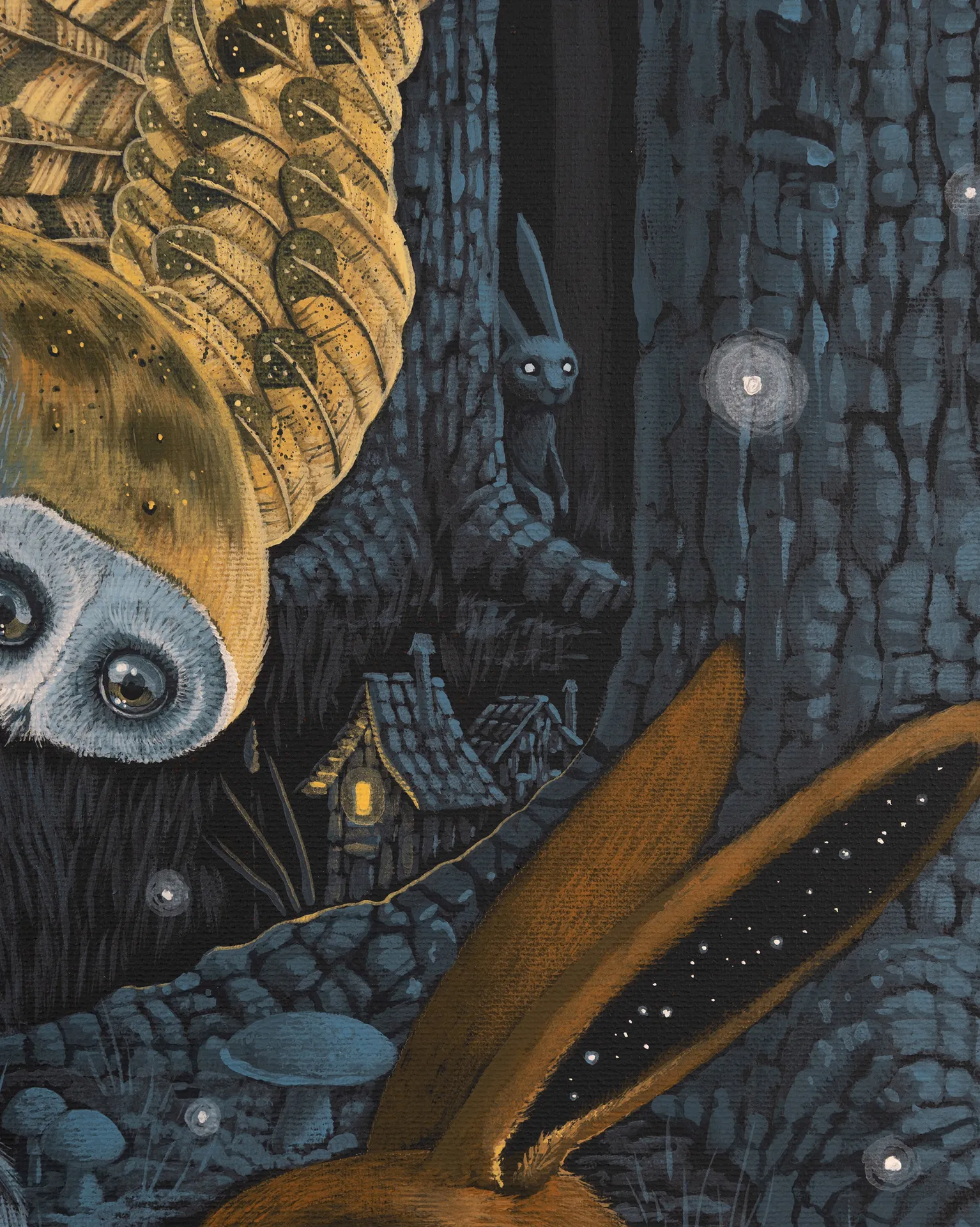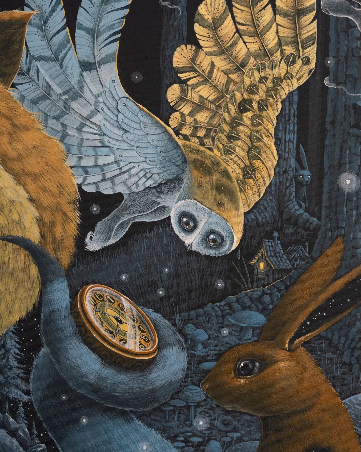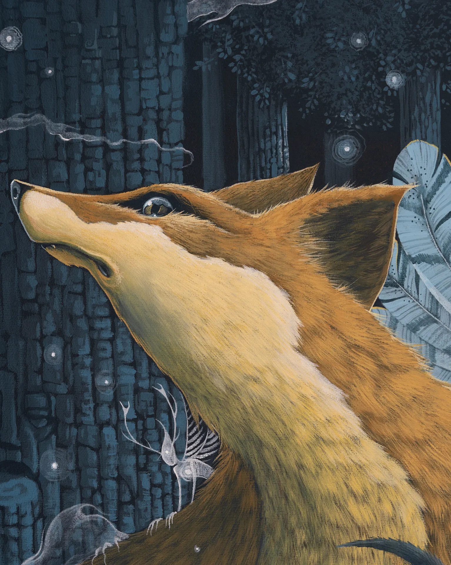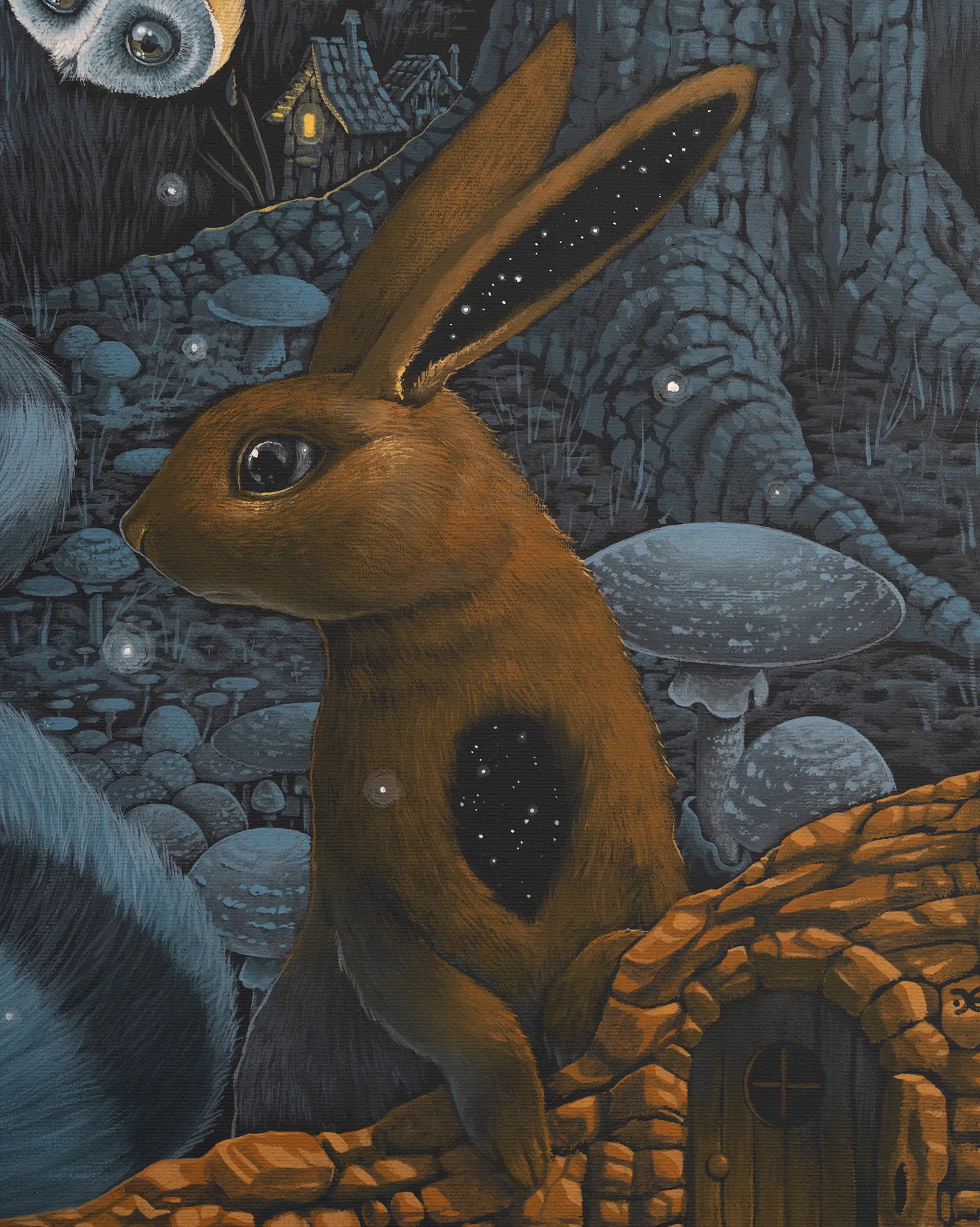 Nel centro del bosco il tempo è arrivato, una nuova fase rappresentata dal coniglio guardiano della soglia si apre custodita tra la volpe e la sua coda, un nuovo fluire sotto le stelle.
