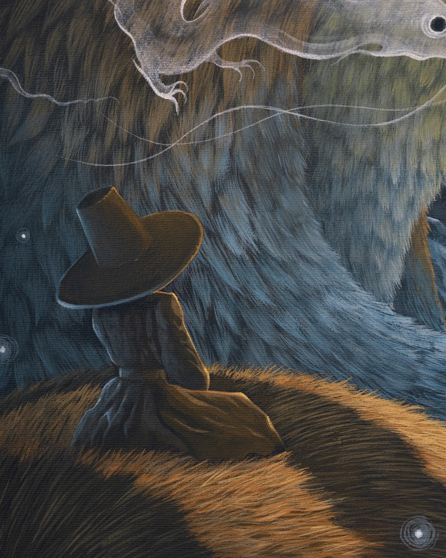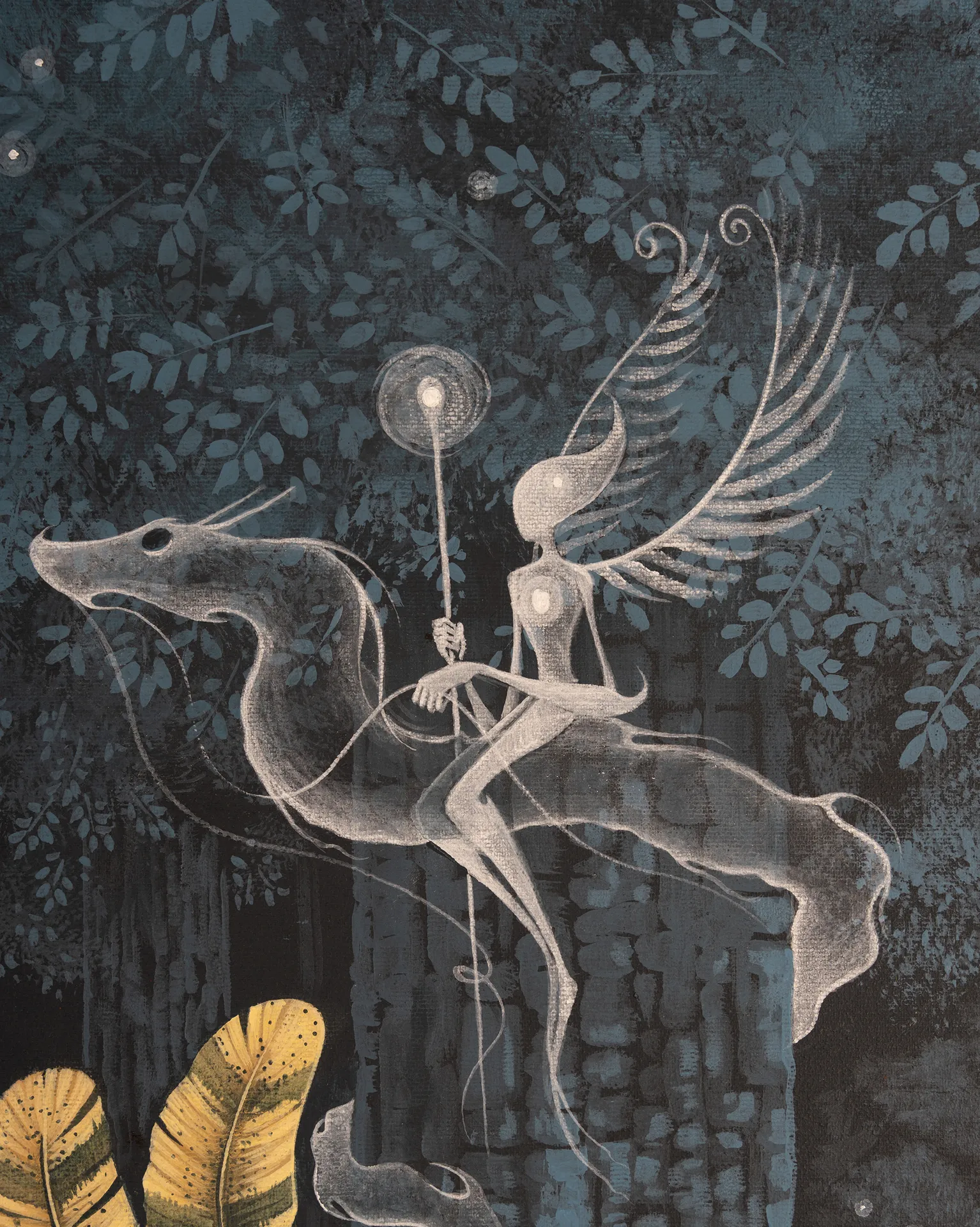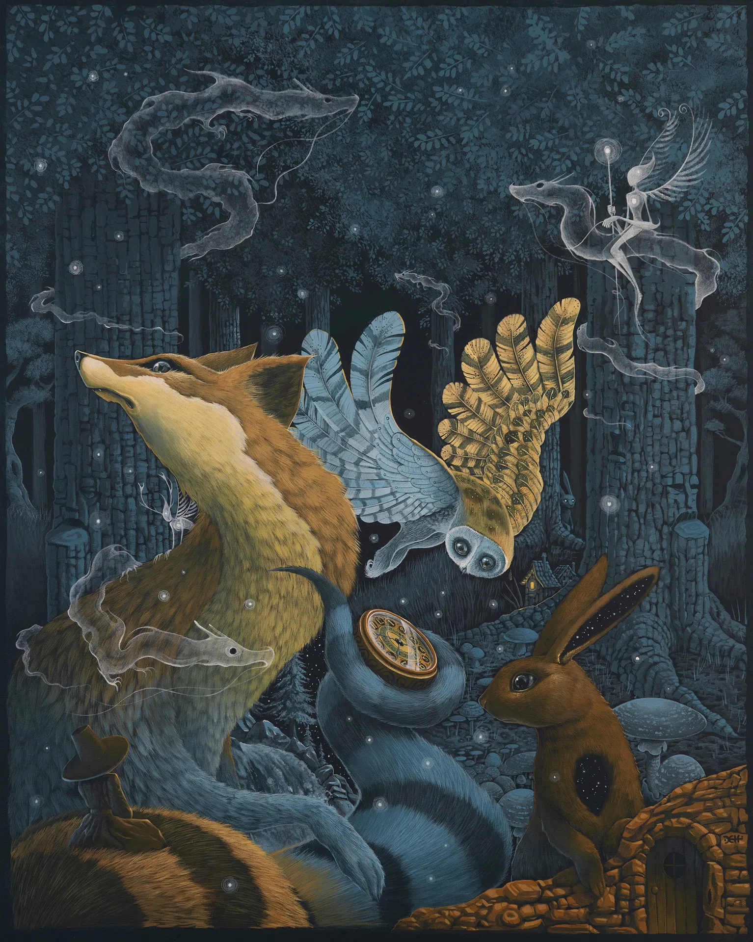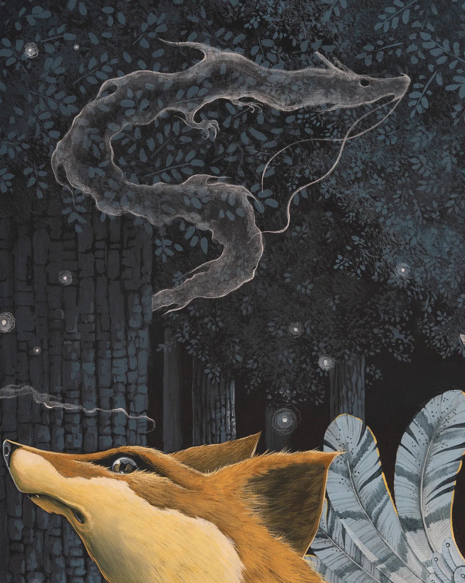 Nel centro del bosco il tempo è arrivato, una nuova fase rappresentata dal coniglio guardiano della soglia si apre custodita tra la volpe e la sua coda, un nuovo fluire sotto le stelle.
