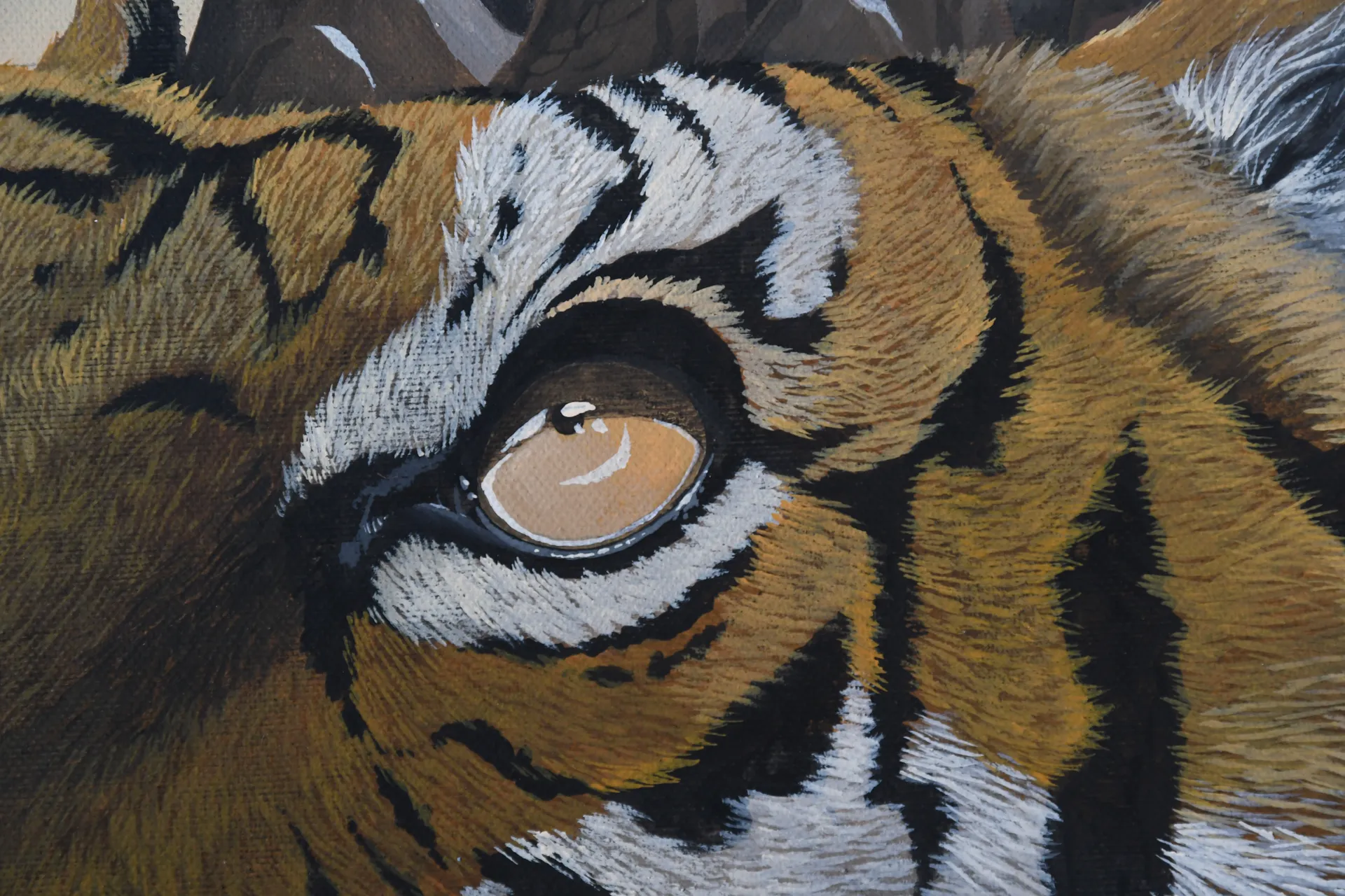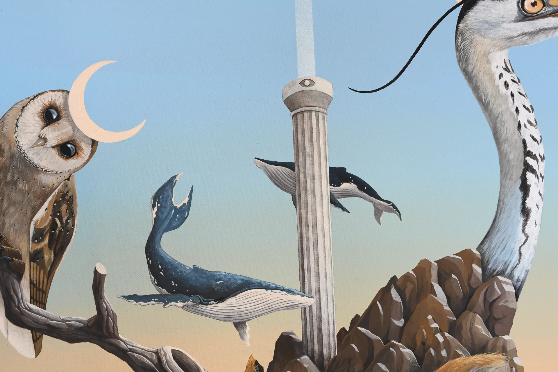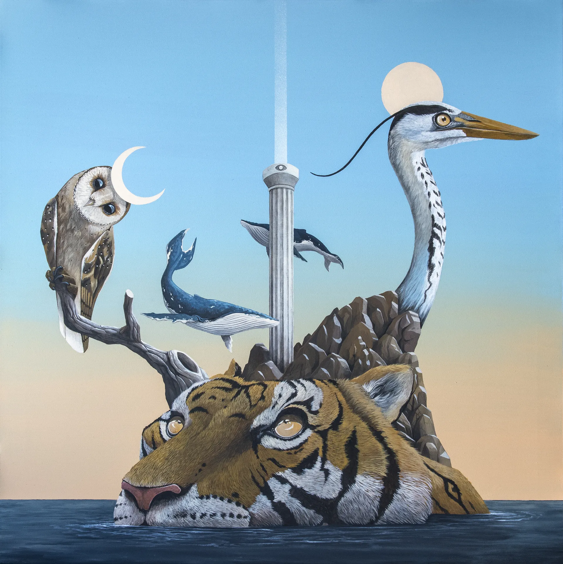Ritratto d’anima di coppia su commissione. Ogni elemento ritrae simbolicamente l’energia di Hariel e Mattia: un’isola sorretta da una tigre, guardiana del sacro, su cui poggia una colonna che connette la materia al Divino. Una coppia che emerge dall’emozione pesante dell’amore pieno di aspettative ma che cerca di guardare oltre e portare attraverso le proprie qualità, simboleggiate dagli animali ed elementi presenti nella composizione, grande insegnamento nel mondo.